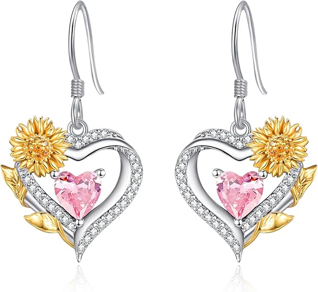 AENEAS Mother's Day Gifts for Mom Sunflower Birthstone Earrings for Women Sterling Silver Sunflower Heart Dangle Drop Earrings Flower Jewelry for Wife Her
